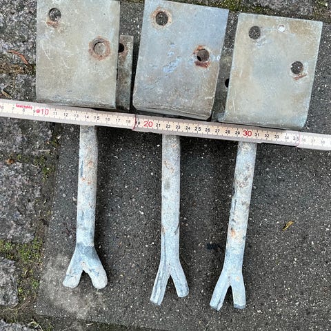 5 stk. galvaniserede jordspyd/stolpesko med beslag til stolper (se billeder).