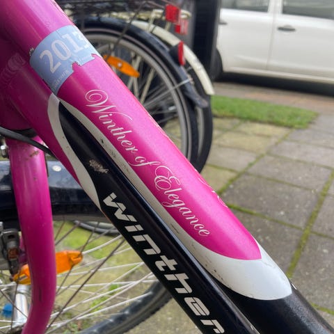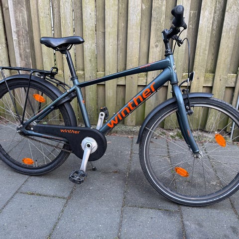 Winther cykel 300 Alu med 24 tommer hjul i mat grøn farve med orange logo. Cyklen har 7 gear (se foto), bagagebærer, skærme, reflekser og støtteben. Kun brugt til en enkelt cykeltur. Derefter opbevaret indendørs.