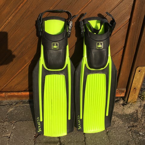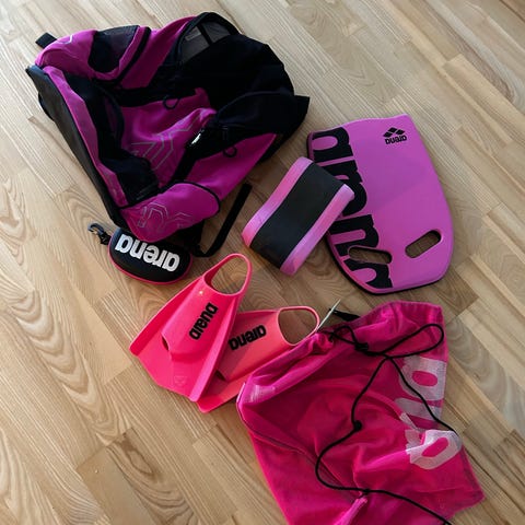 THEMAGIC5 svømmeudstyr sæt indeholder et kickboard, snorkel, svømmefinner og en opbevaringspose.
