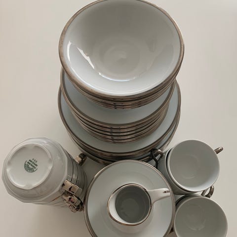 Pillivuyt bistro porcelæn med sølv kant, tallerkner, skåle, kopper, fade og æggebægere.