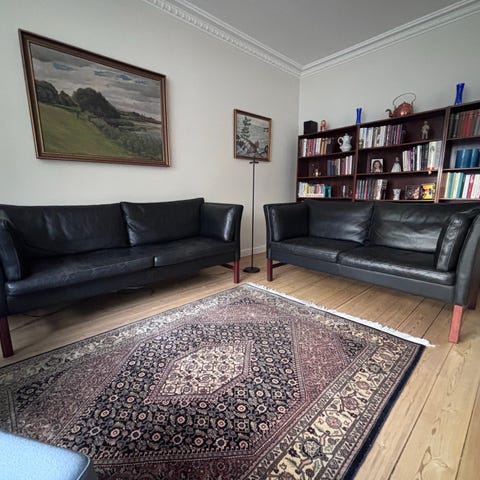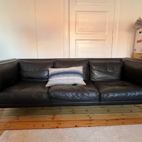 To sofaer - en tre personers og en to personers i blødt mørkebrun okselæder. Virkelig behagelig, retro og smuk - særligt armlænene er jeg personligt ret vild med. Sælger kun, da min mand ikke vil have lædersofa.
