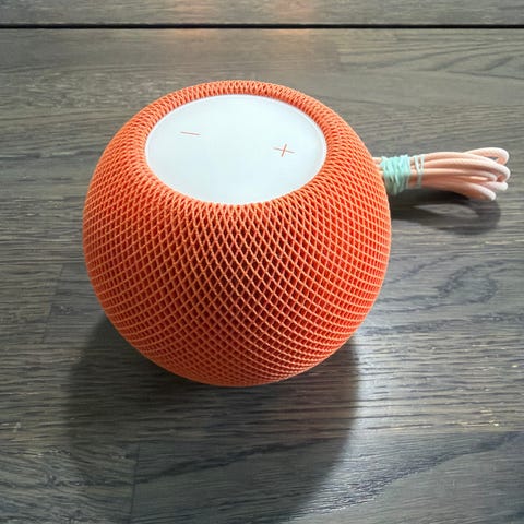 Apple HomePod mini højttaler i blå farve med rund form og stofbetræk. Designet til at levere lyd i høj kvalitet til brug i hjemmet.
