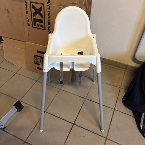 IKEA højstol til børn med hvid bakke og metalben. Stolen er designet til at give støtte og komfort til små børn under måltider. Kan bruges både ved spisebordet og som selvstændig stol.