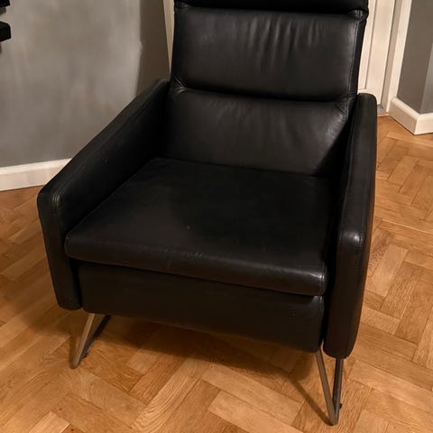 BoConcept lænestol i sort læder med metalstel. Lænestolen har et moderne design med et højt ryglæn og buet form, der giver støtte og komfort. Stellet er lavet af metal, hvilket sikrer stabilitet og holdbarhed. Sælges på grund af flytning.