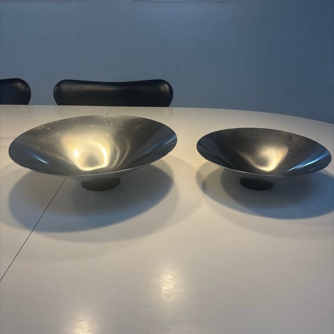 Georg Jensen skål fremstillet i rustfrit stål med en unik, moderne form. Skålen har en blank, spejlpoleret overflade og kan anvendes til servering eller som dekorativ genstand.