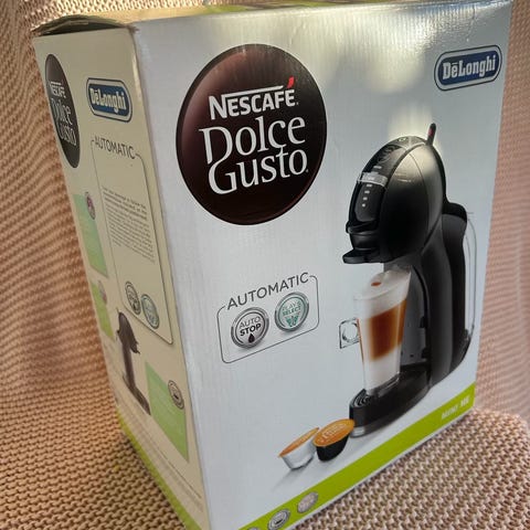 Nescafé Dolce Gusto kaffemaskine med sort og sølv farve. Maskinen bruger kapsler til at brygge kaffe og leveres med flere kapsler samt afkalkningsmiddel. Strømforsyning via stikprop.