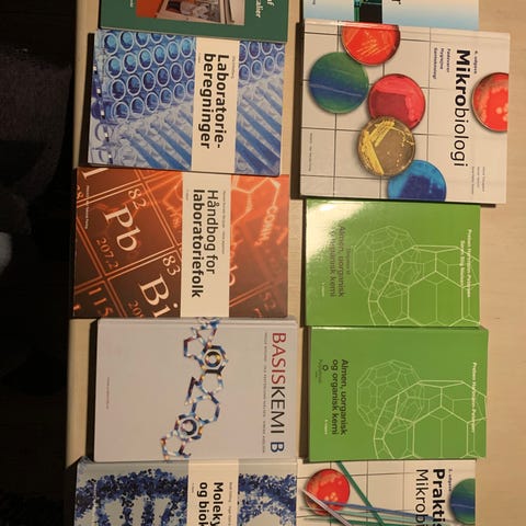 Bøger til laborantstudiet. De fleste bøger er næsten helt nye og ikke blevet brugt særlig meget.