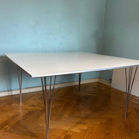 Piet Hein spisebord købt på Lauritz.com i 2021. Det har nogle synlige brugsspor, dog ikke noget man ser meget. Benene kan klikkes af. Det skal bæres ned fra 4. sal. Det vejer godt, så man skal være to til at bære det. Vil gerne evt hjælpe :)