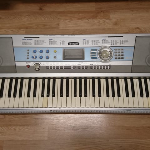 Yamaha YPT-230 keyboard med 61 tangenter, sort farve og indbygget LCD-display. Tastaturet har forskellige stemmer, stilarter og sange, egnet til musikøvelser og begyndere.