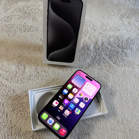 Sælger min iPhone 15 Pro Max i farven White Titanium med 256 GB lagerplads.