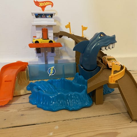 Hot Wheels Viper Bridge legetøjsbane med to små biler. Banen er orange med en blå bro og inkluderer en bro med rampe formet som en slange. Egnet til børn til leg og underholdning.