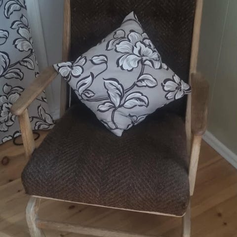Meget flot og gammel gyngestol i egetræ med polstret og betrukket sæde.