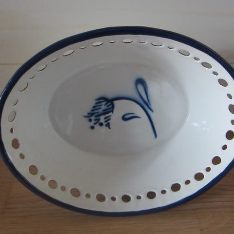 Italiensk San Marco oval porcelænsskål med dekorativt blomstermotiv i flere farver. Skålen har en bølget kant med grøn detalje og er egnet til servering eller dekoration.længde 42x34 pris 450kr