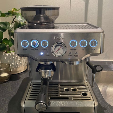 Sage Barista Express espressomaskine i rustfrit stål med indbygget kværn. Maskinen har flere knapper til styring af brygning, trykmåler og dampstav til mælkeskumning. Velegnet til tilberedning af espresso og mælkebaserede kaffedrikke.