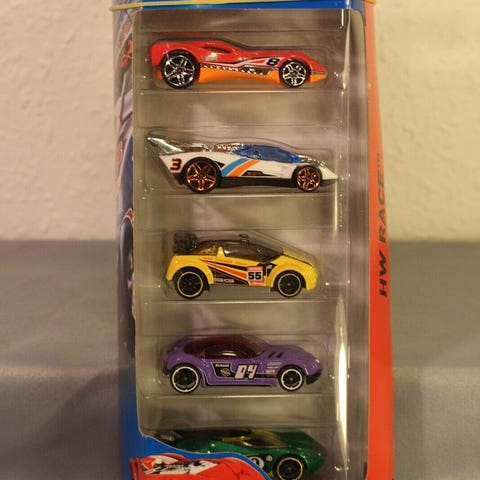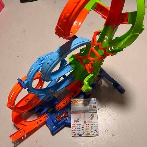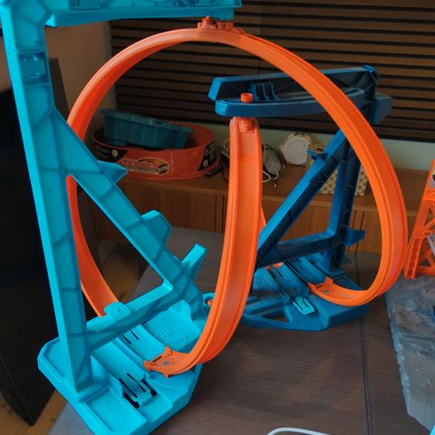 Hot Wheels legetøj bestående af en bilbane og en blå bil med gule hjul. Produktet er designet til børn og er lavet af plastikmateriale.