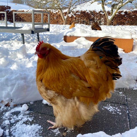 Lækker stor Orpington hane. 24 uger. Passer godt på damerne. Han er ikke ren gul, men har en flot sort hale.