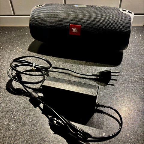 JBL Bluetooth højttaler i sort farve. Designet til trådløs lydafspilning med indbyggede kontrolknapper til tænd/sluk, lydstyrke og afspilning. Materialet består af tekstil og plastik, hvilket gør den holdbar til daglig brug.