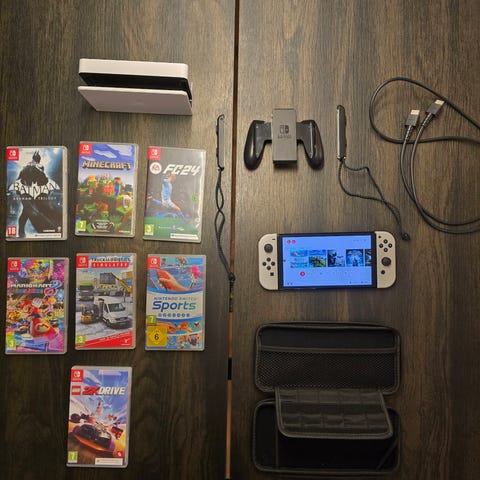 Nintendo Switch konsol med original dock, opbevaringsetui, oplader og forskelligt tilbehør. Udover Joy-Con controllere er der også en Pro Controller med, samt to super gode spil: Mario & Sonic at the Olympic Games og Super Mario Odyssey. Sælges kun som samlet pakke