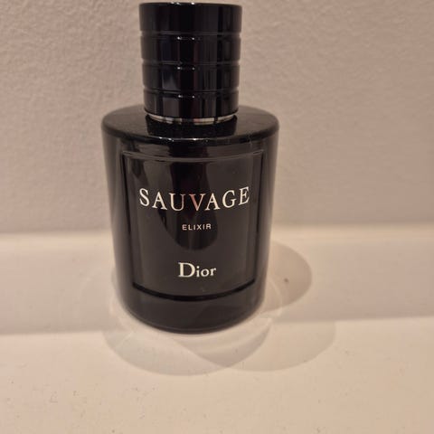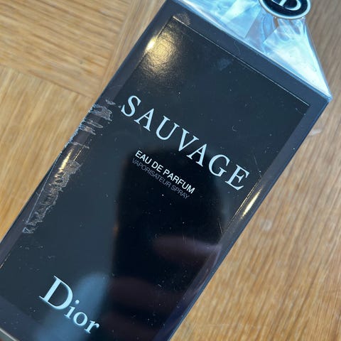 Dior Sauvage parfume i sort flaske. Produktets størrelse og yderligere specifikationer er ikke angivet.