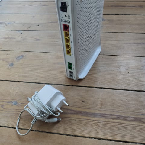 Yousee Router med flere porte til netværksforbindelse. Enheden er hvid og designet til internetforbindelse i hjemmet eller kontoret.