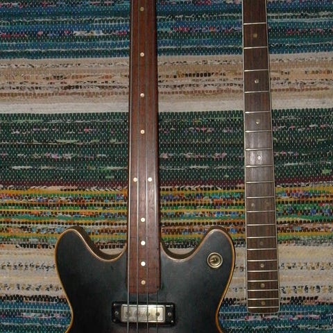 Båndløs Mørch M 48 5-strenget basguitar med aktiv forforstærker. Den med krøllen.