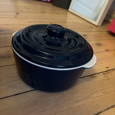 Det er en Fontignac cocotte (lille gryde) i mørkeblå keramik.