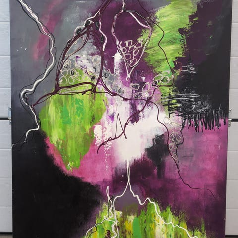 Maleri, abstrakt, af kunstner Richard Price. Motivet består af en abstrakt komposition af primært cirkler og streger i brune nuancer. Maleriet er signeret.