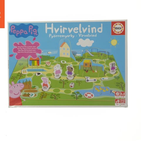 Peppa Pig legetøjstog i træ bestående af et lokomotiv og tre vogne i farverne rød, gul og blå. Legetøjet forestiller figurer fra Peppa Pig og er designet til børn.