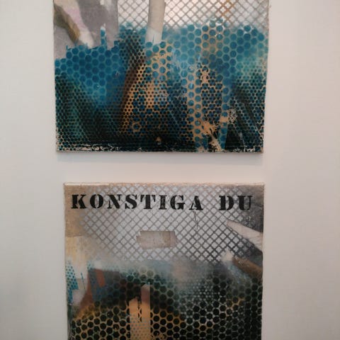 Mixed-media værk af Frodo Mikkelsen (1974-2024), to rammer på hver 80x100 cm, samlet og ophængt; l: 160 cm, h: 100 cm. Fra 2000-2002. Overvejende udført af bemalet skumgummi og hvid, armeret presenning.