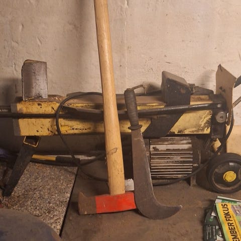 Lille håndøkse: Klassisk mindre økse til at lave optændingsbrænde. Den har lidt overfladerust, men fungerer upåklageligt efter en slibning.