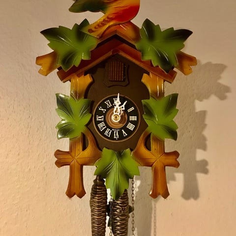 Flot og velholdt gammelt kukur i træ med fine håndskårne detaljer: blade, fugl på toppen og traditionelt urværk. Uret har lodder og kæde og fremstår som et klassisk vægur i Schwarzwald-stil.