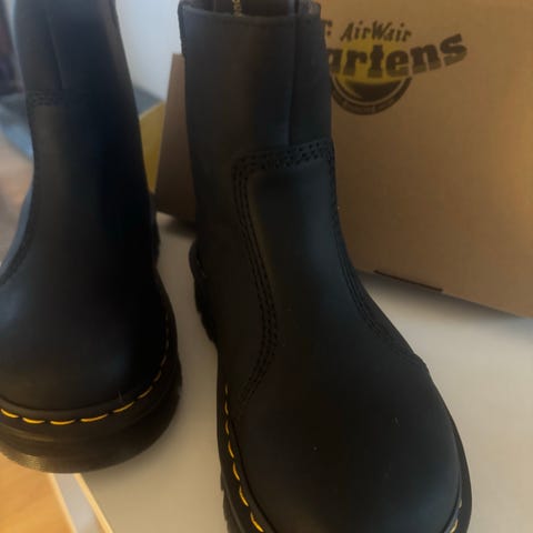 Dr. Martens Støvler i størrelse 38 med sort lakfinish. Støvlerne har snørelukning og den karakteristiske gule syning langs sålen.