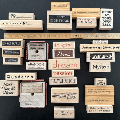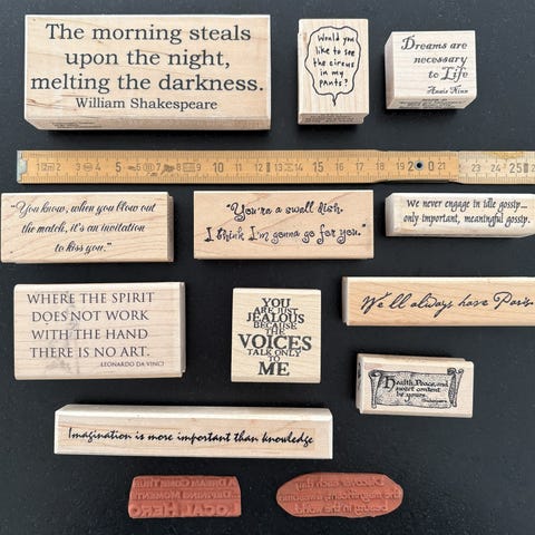 Stempler af gummi med alfabet til stempling på papir og karton. Nogle monterede på træklodser, andre løse. Se billederne.