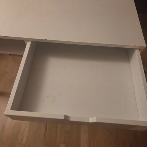 Desk I træ malet i hvidt med struktur. 163 cm bred, 52 cm dyb , 97 cm høj.