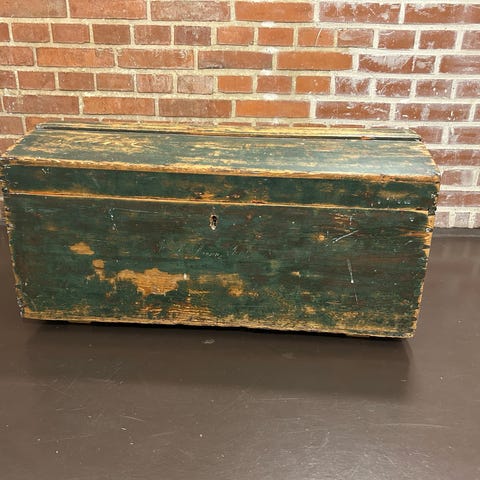 Smuk og charmerende antik kiste i en skøn mintgrøn farve sælges. Kisten har en flot, autentisk patina, som giver masser af karakter, samtidig med at den er fuldt funktionsdygtig. Den er meget rummelig og byder på fine, hyggelige rum indvendigt – perfekt til både opbevaring og som et dekorativt statement i hjemmet.