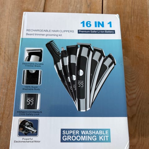 Ego Professional hårtrimmer med tilbehør inklusive to kamme, oplader og olie til vedligeholdelse. Trimmeren har en lithium-ion batteri og flere justerbare indstillinger til præcis trimning.