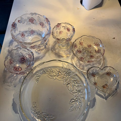 Lagkagefad og servicering fad/skål og en glasskål med låg fra walther glas, sandsynligvis af mrk satin rose. Fremstår i perfekt stand.