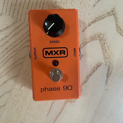 Den klassiske MXR Phase 90 guitar effektpedal i orange farve. Pedalen har en enkelt speed-knap til justering af effektens hastighed. Den har input- og output-tilslutninger samt strømforsyningsindgang. Pedalen er designet til brug med elektrisk guitar og kan anvendes til at skabe faseringslyde.