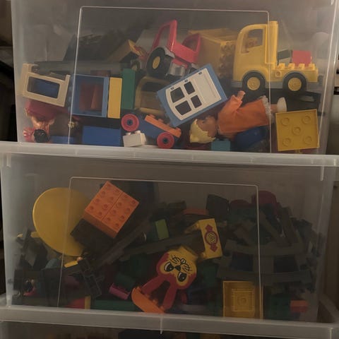 En kæmpestor kasse duplo med elektrisk tog der virker og en masse klodser, biler , plader , dyr mm.