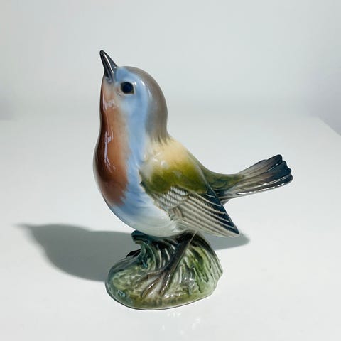 Dahl Jensen colorado-Fugl figur i grå og blå porcelæn. Dekorativt samlerobjekt med detaljeret udformning og glaseret finish.
