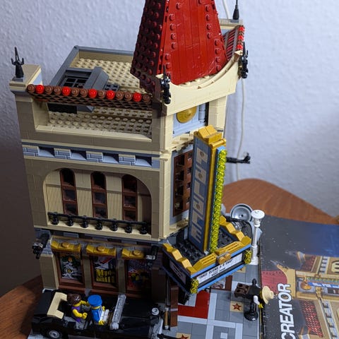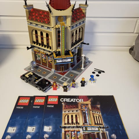 LEGO modular Creator Palace Cinema 10232 med detaljeret facade, indendørs biografsal, billetluge og tilhørende LEGO-figurer. 100% komplet med byggevejledninger.