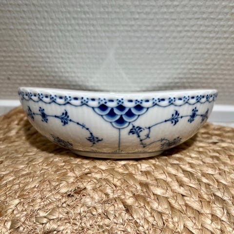 Royal Copenhagen Musselmalet Riflet skål i porcelæn. Skålen har klassisk blå og hvid farve med musselmalet mønster. Velegnet til servering og dekoration. Prinsesse oval skål 37 cl 2 stk.