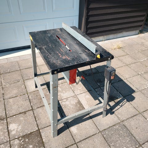 Tecnic bordrundsav med stander. Savens bord er lavet af metal og den har en rundsavklinge monteret. Maskinen er udstyret med en justerbar vinkelindstilling og en sikkerhedsskærm over klingen. Der medfølger brugsanvisning og tilbehør såsom skruenøgle og føringsskinne. Velegnet til præcisionsskæring af træ og andre materialer.