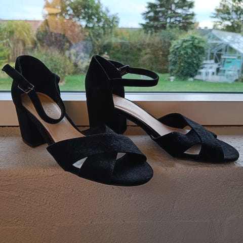 Bianco højhælet sko i størrelse 36. Skoene er sorte og har en kombination af materialer med en del i ruskind og en del med mønster i sort. Højhælede med ankelrem og lukning.