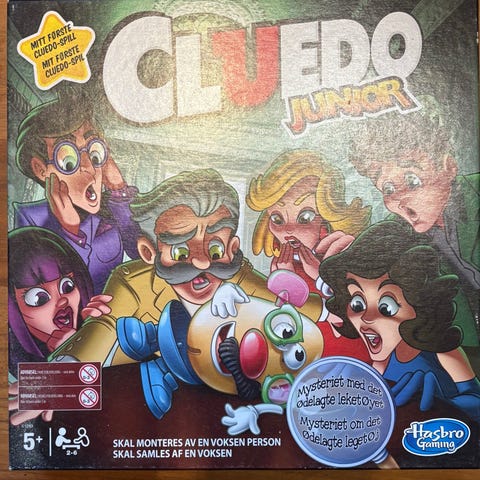 Hasbro Cluedo brætspil med klassisk mordmysterietema. Spillet indeholder brikker, kort og spilleplade til 3-6 spillere fra 8 år og op.