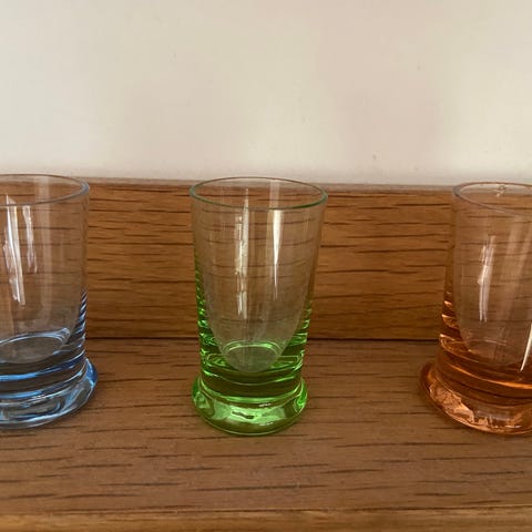 8 små snapseglas (ca. 1940) ca. 2 ml. Jeg kender desværre ikke mærket.