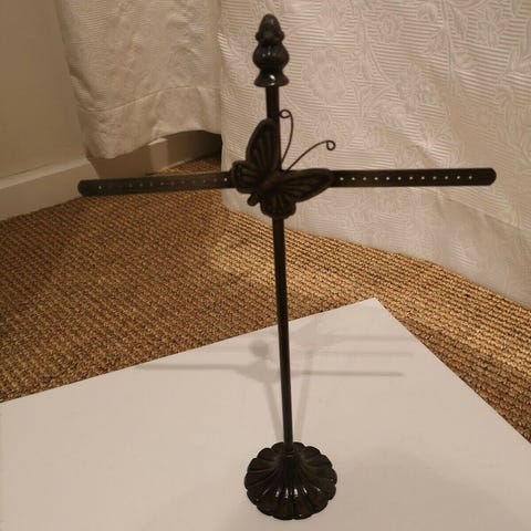 Flot og praktisk smykkestativ i sort metal med plads til øreringe, armbånd og halskæder.