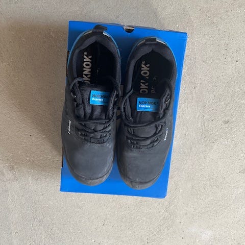 Sikkerhedsstøvletter fra noknok str 44. Brugt et par gange på en mark, men er ikke slidt på nogen måde.