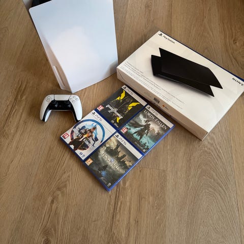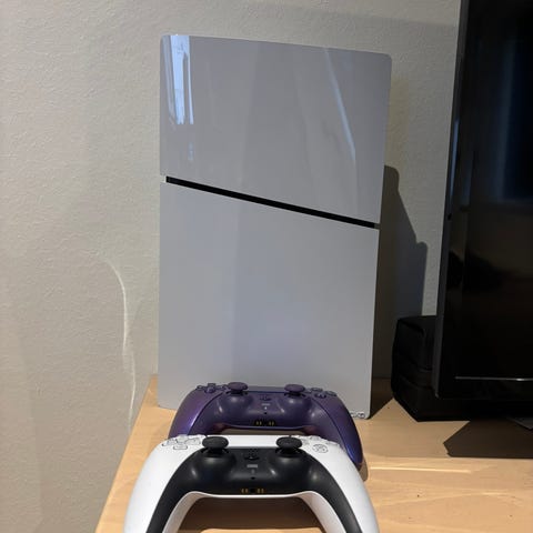 PlayStation 5 slim digital 1tb med to trådløse controllere. Der er både strøm og ladekabel med og den er brugt meget lidt og i rigtig god stand.