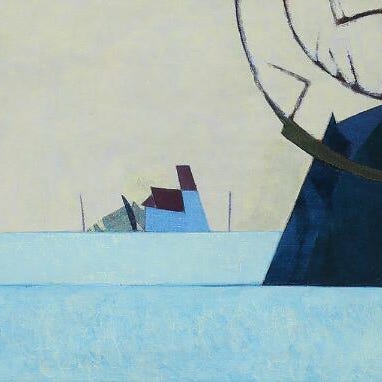 Signeret maleri med motiv af landskab, herunder by og sø. Maleriet er udført i farverige nuancer og viser en gade med bygninger og biler samt et område med træer og vand.